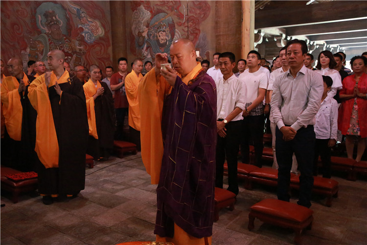 在青龙寺内大日如来佛下,印顺法师念诵经咒,两序大众纷纷跟随唱诵,声彻半空。