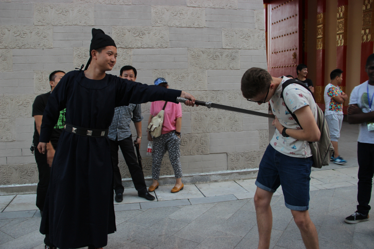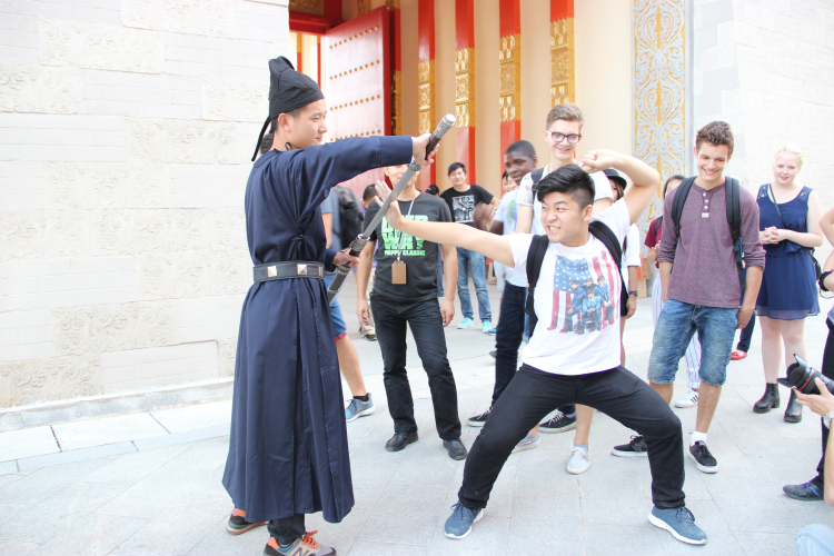 第三出是幕跨国合拍主打动作戏!昨天一帮金发碧眼、肤色各异的国际留学生也慕名来到中国唐城,感受中华文化的博大精深。这些活泼的骚年们,啧啧赞叹中国古代建筑之美的空档,还不忘与大内高手切磋武艺。现场可以说是剑拔弩张、刀光剑影,请自备3D眼镜欣赏这些武(gao)术(xiao)奇(dou)才(bi)们精彩演出吧!