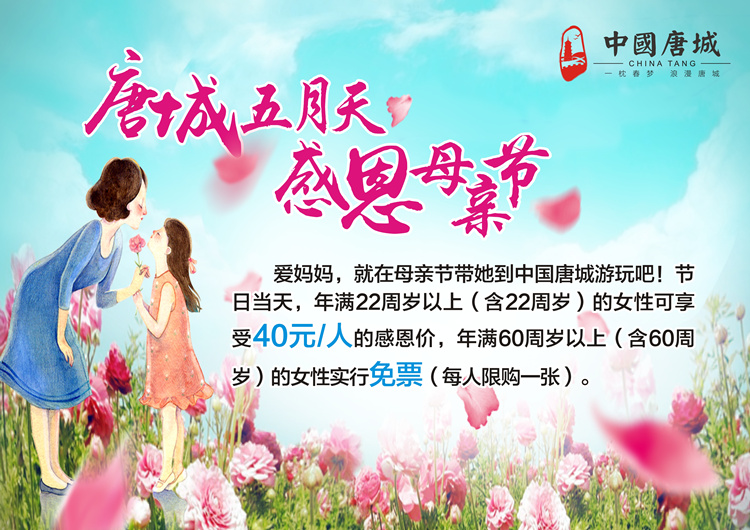 针对成年儿女推出背着母亲游唐城活动,活动地点设在朱雀廊,活动当天只需背着或抱着母亲在朱雀廊前行50米即可获得唐城景区提供的明信片或康乃馨一支送与母亲。(送完为止)